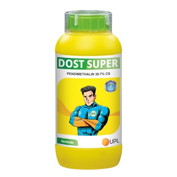 UPL Dost Super is a pre-emergent herbicide containing Pendimethalin 38.7% CS, designed to control annual grasses and broadleaf weeds in crops like soybean, cotton, chili, and onion. Applied before weed emergence, it inhibits cell division in germinating weeds, ensuring effective weed management and promoting healthier crop growth.